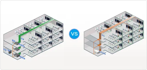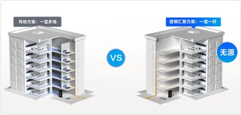 首推以太全光架构,交换机入室,核心-汇聚-接入三层网络架构变为核心-楼栋-室内,取消楼层弱电间