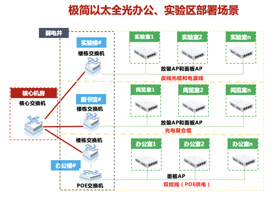 尊龙时凯极简以太全光智分+解决方案,适配高校应用场景,利用光纤线缆超长传输距离、超长使用寿命、节省布线空间和节能环保等优势,融合全光智分+主机的集中供电方案为校园网提供定制化无线服务,满足校园网场景对无线的高带宽、低时延诉求,提升运维效率。