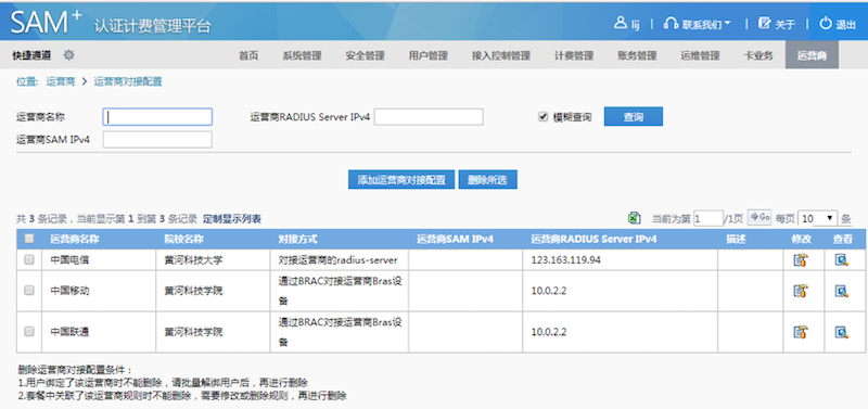 全校通过1台路由器,实现与联通(Bras对接)、电信(Radius-server对接)、移动(Bras对接)的灵活对接。高出口带宽满足全校师生的高速上网需求。