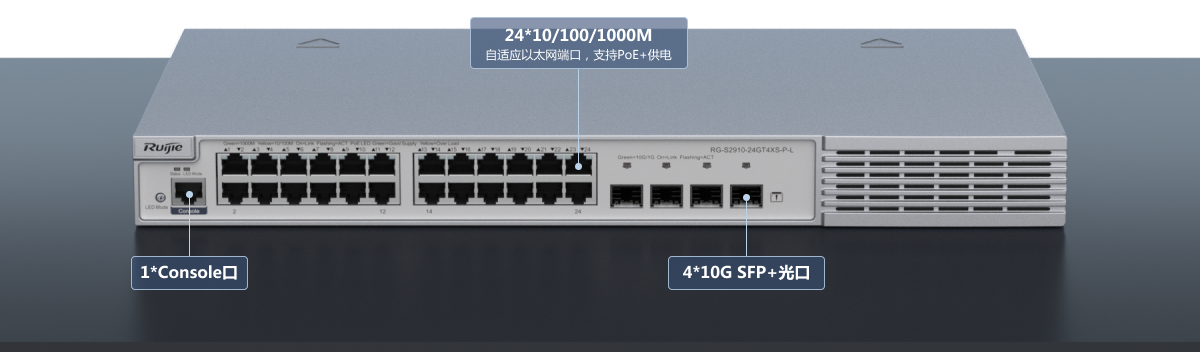 RG-S2910-L系列交换机为园区网络接入设备提供千兆到桌面应用,同时提供大容量的千兆和万兆上行带宽,满足接入用户信息量日益增长的需要。