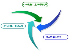 二、内部网络接入终端不安全。GARTNER报告显示,损失5万美金以上的攻击70%涉及内部安全。在用户接入内部网络时,需要对其进行认证,保证接入安全,避免将病毒、木马带入局域网。