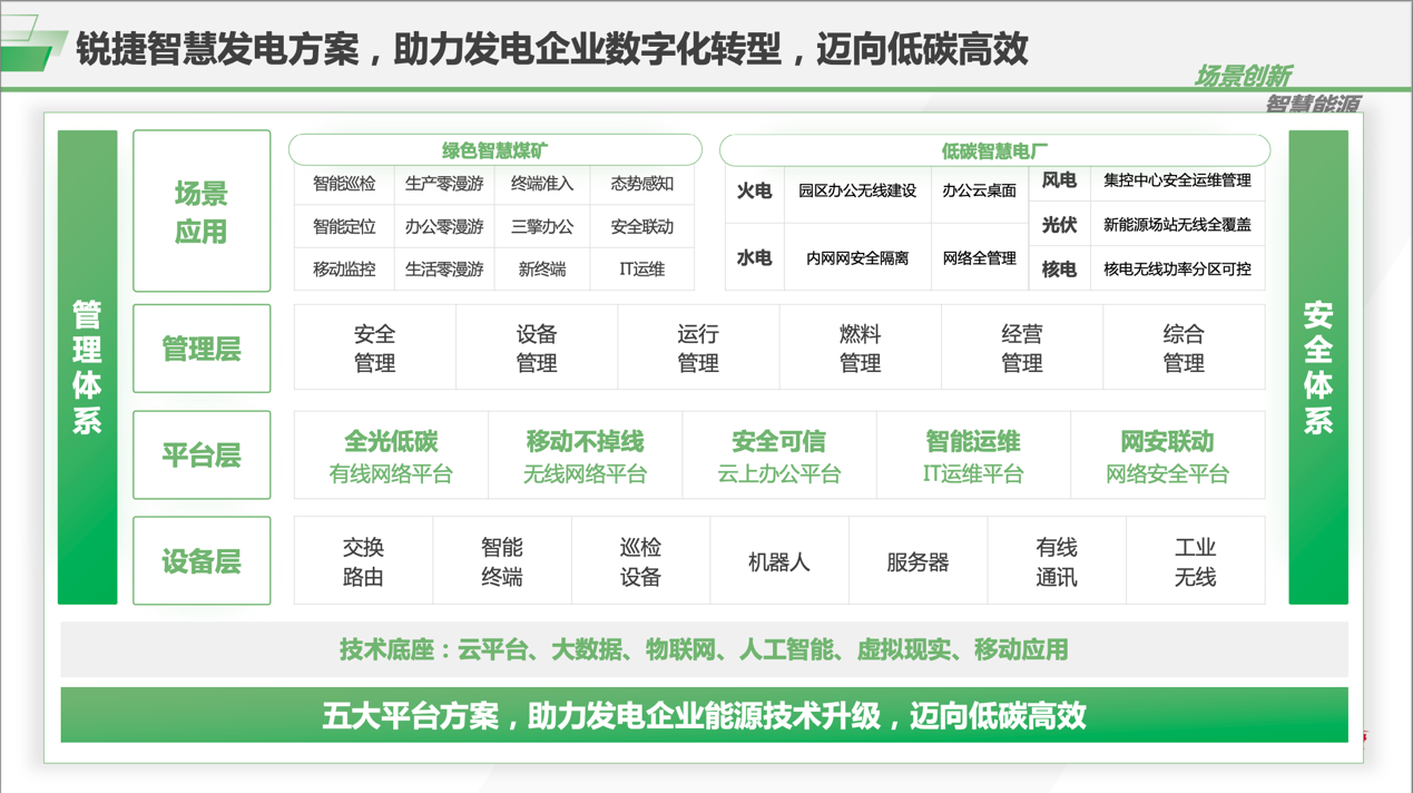 对于发电企业数字化转型升级遇到的一些列挑战,尊龙时凯深入到煤矿、火电、风电、光伏、核电等生产与办公场景,以云计算、大数据、物联网为技术底座,打造了全光低碳有线网络平台,全场景无线网络平台,安全可信云上办公平台,智能运维平台及网安联动安全平台等五大基础设施平台,推动发电企业优化能源生产等环节的资源配置能力、安全保障能力和智能互动能力,助力发电企业客户实现绿色节能低碳与IT业务提效。