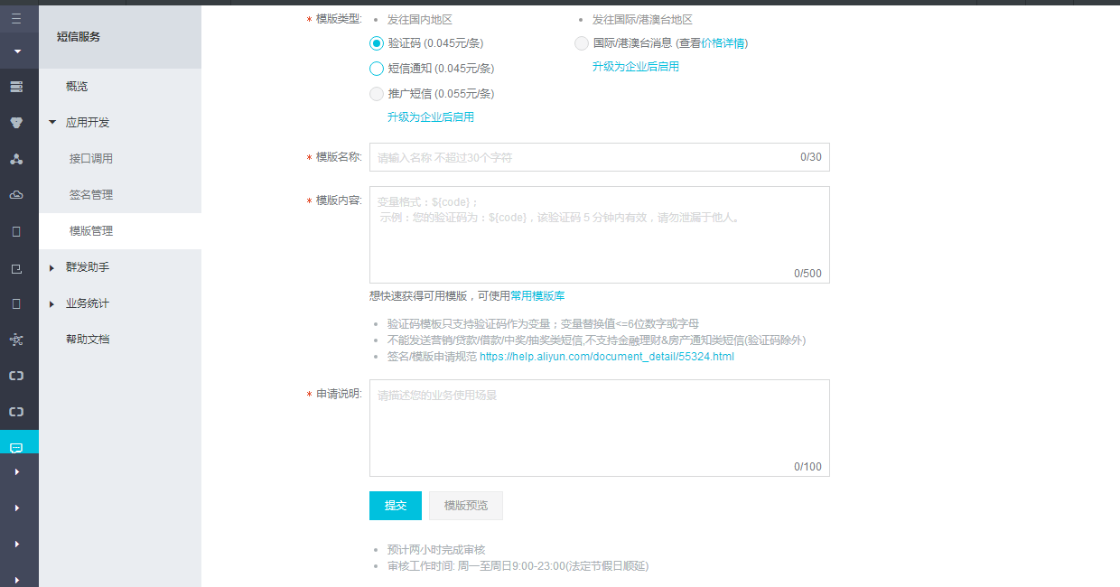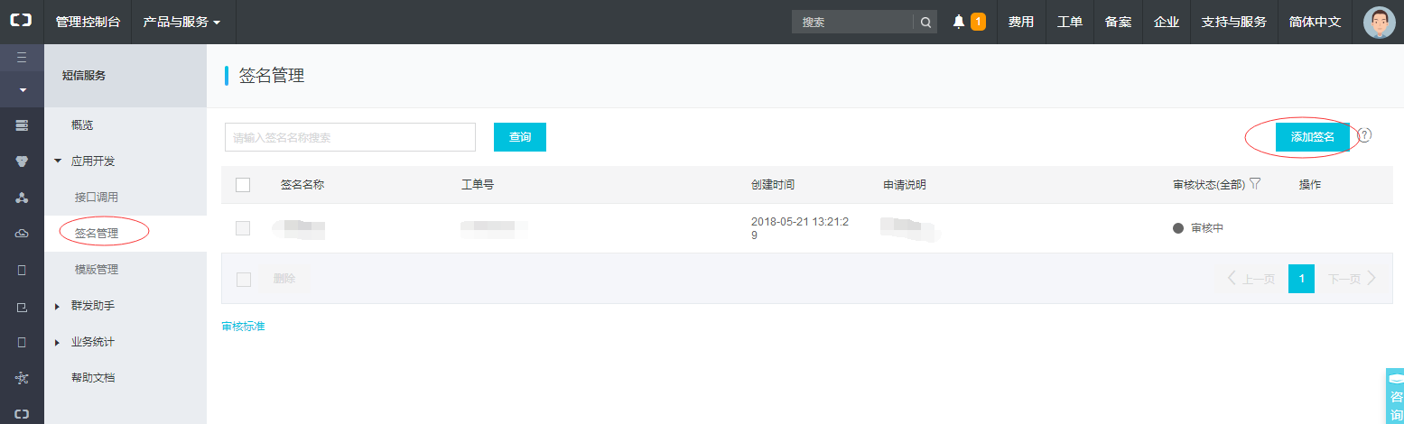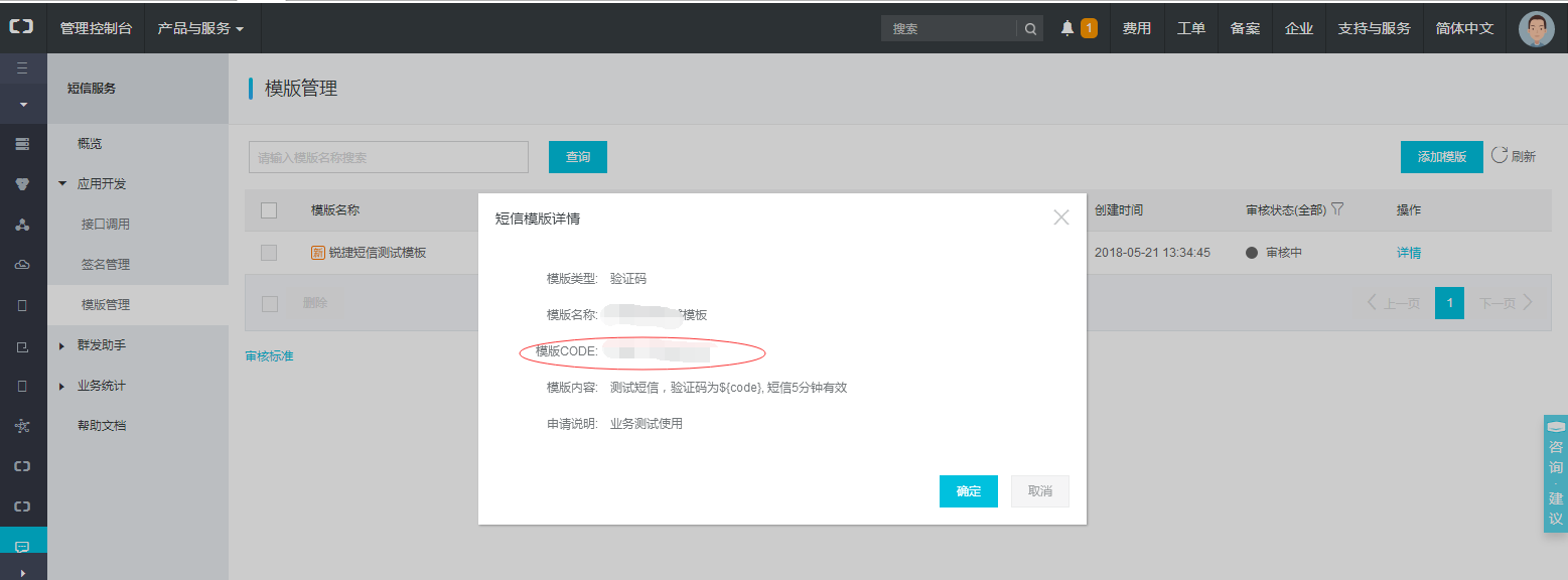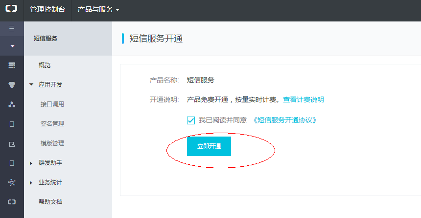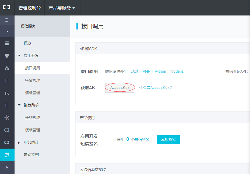 注册完成后登陆阿里云平台,通过导航菜单进入短信平台配置页面