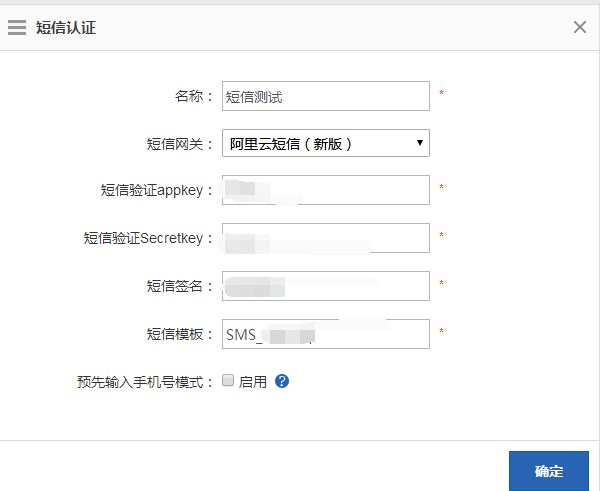 短信验证appkey和SecretKey: 分别填入步骤1申请的AccessKeyId和AccessKeySecret。