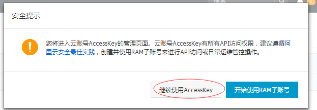 阿里云提供了RAM子账号功能用于提升账号安全性,参考阿里云网站说明。这里选择继续使用AccessKey。