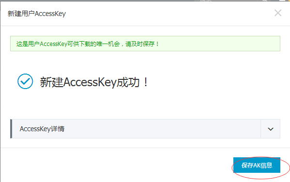 选择创建AccessKey,按照页面步骤完成创建同时保存AccesssKey信息