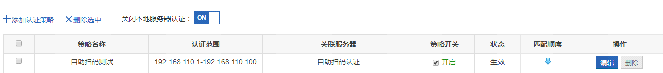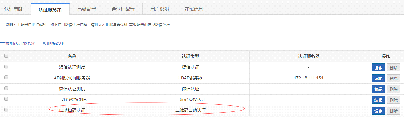 4. 认证服务器项勾选需要匹配的认证方法,本例选择“自助扫码认证”