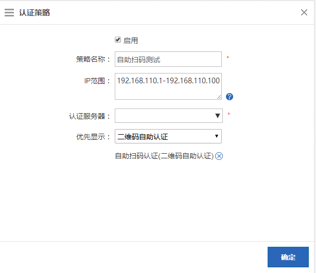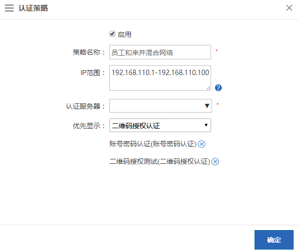 5. 优先显示项用于选择多个认证服务器时,选择在portal(认证页面)上优先显示的认证方法。本例选择“二维码授权认证”